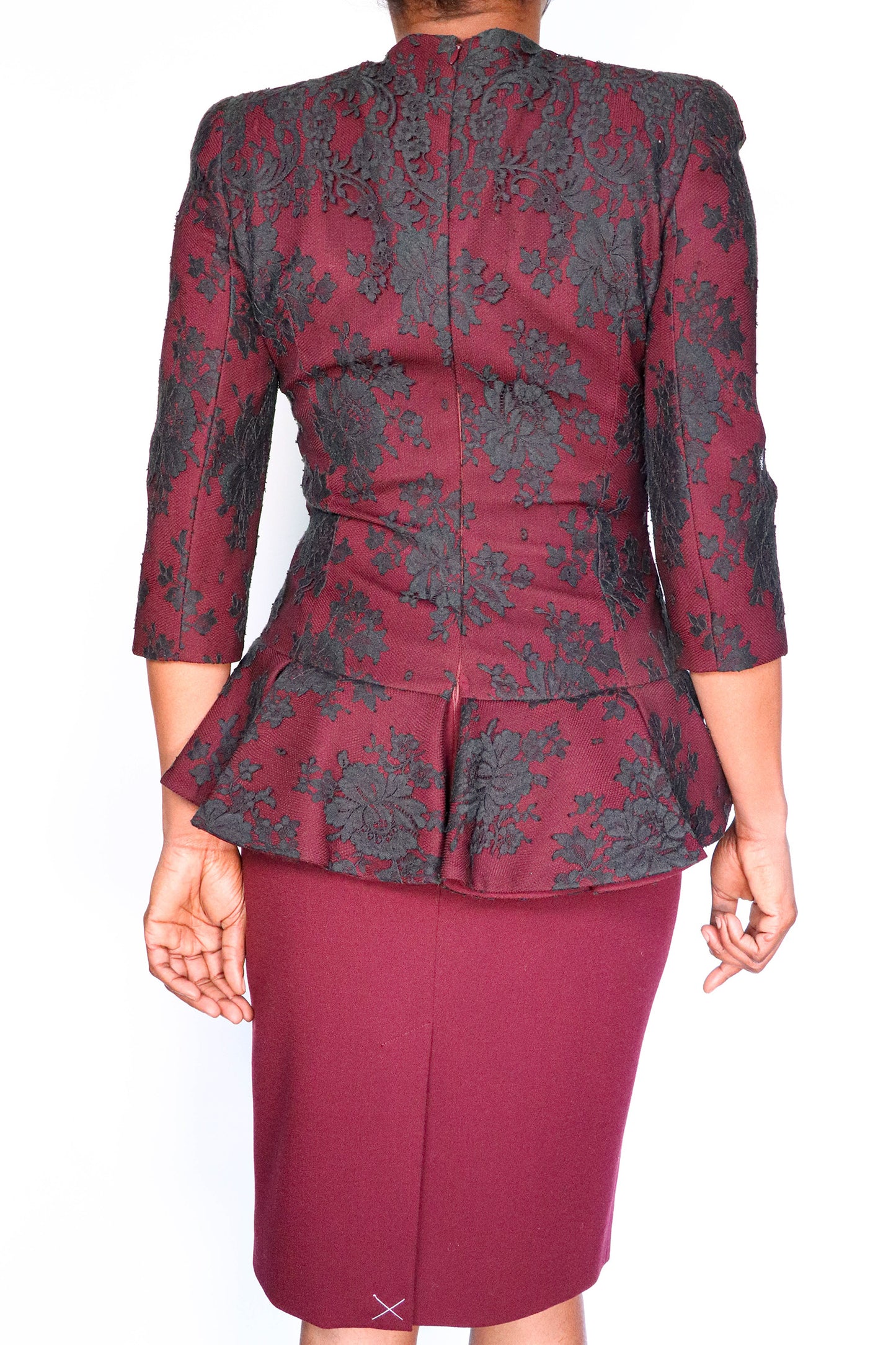 If you marvel at the designs the fashion house of Alexander McQueen, this dress will fit perfectly in your closet. Feel poised dressed in beautiful black lace detailing fashioned over a deep wine hue. Exude a curvy silhouette with the classic peplum style with zippered back closure. Fabric 1: 70% Cotton, 30% Polyamide. Fabric 2: 100% Polyamide. Fabric 3: 100% Lana Wool. This item is preowned without stains, lose threads or rips. Italian size 44 converts to a US 8.