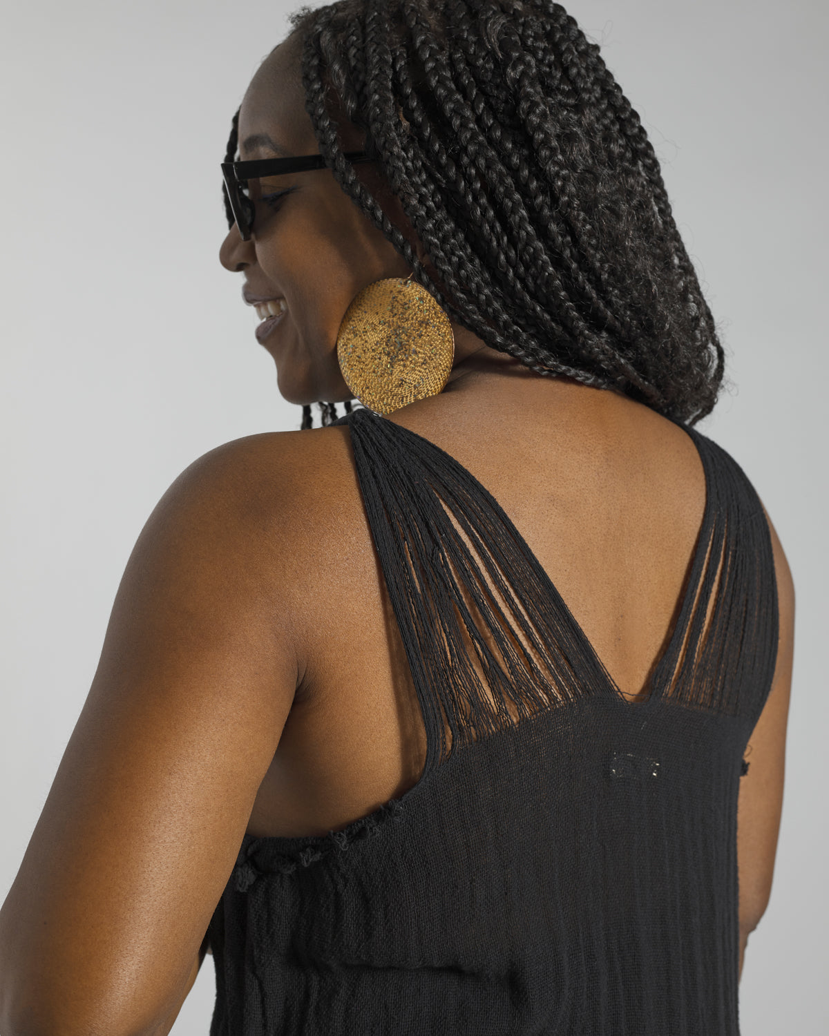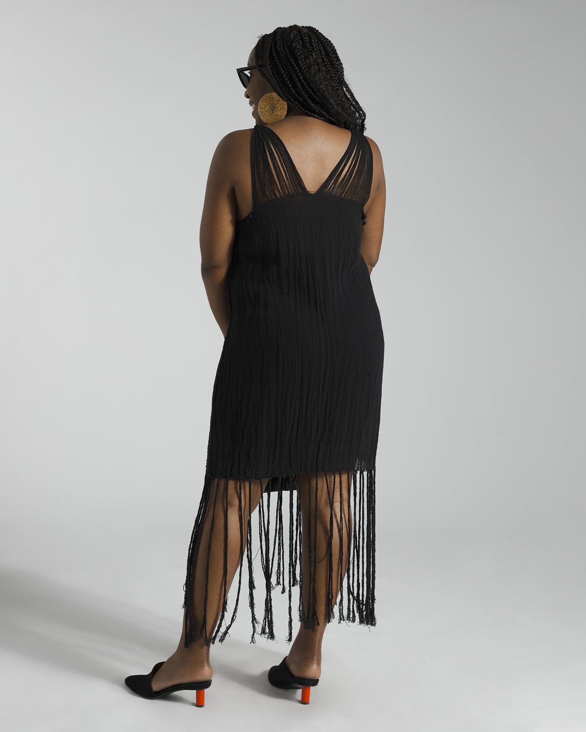 Transport yourself to the beaches of Tulum with this unique black fringe hem minidress with gathered fringe straps in a soft cotton fabric. New with tags, excellent condition. Dry clean only.