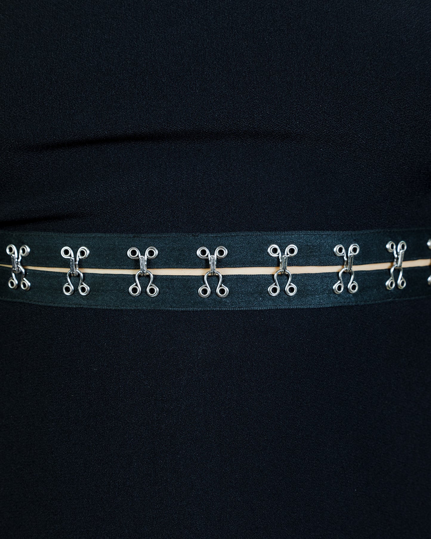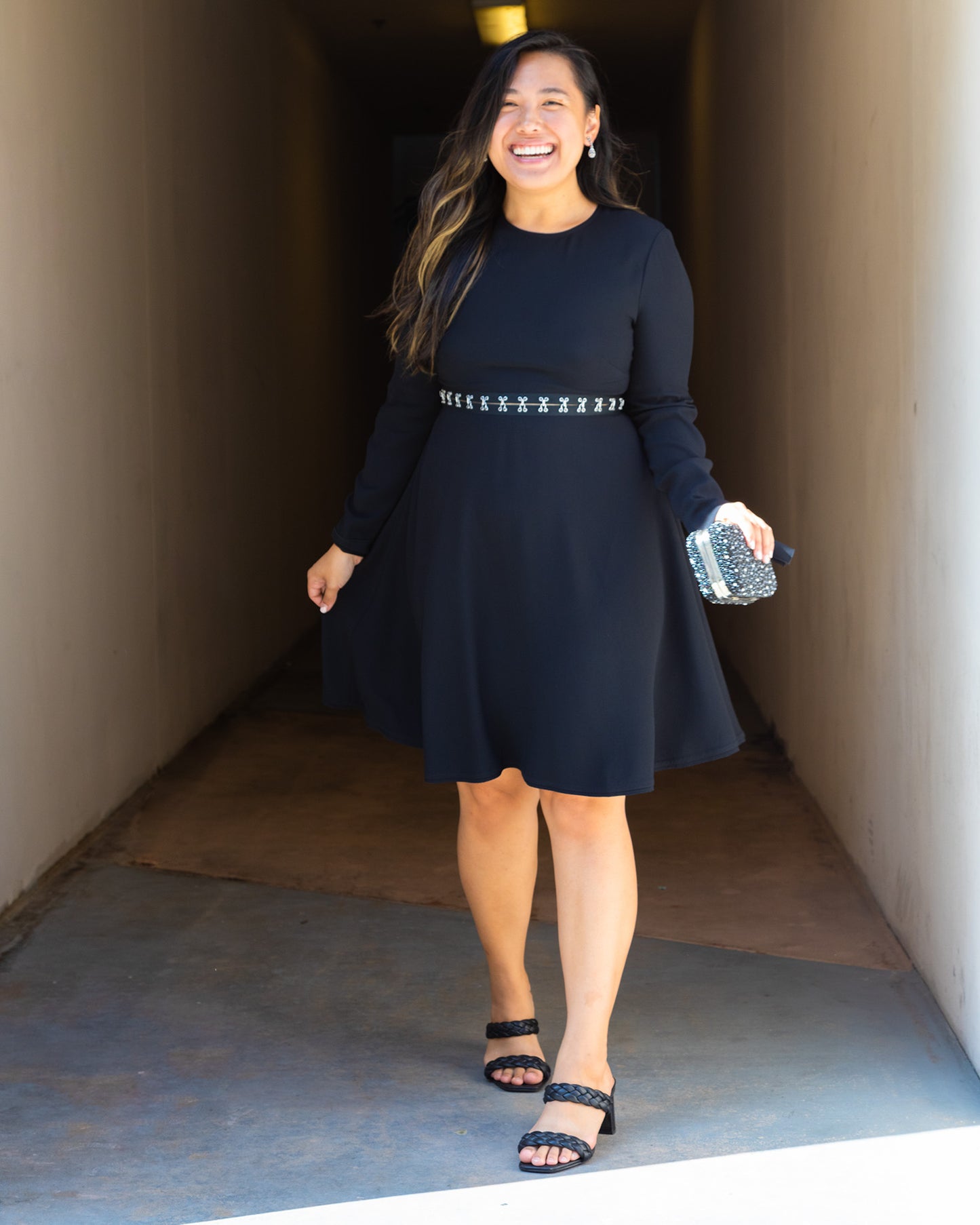 This LBD is designed with a crew neckline; open at back, long sleeves with atelier-style bows, empire waist, A-line silhouette, Hidden back zip, and made from Acetate/viscose.