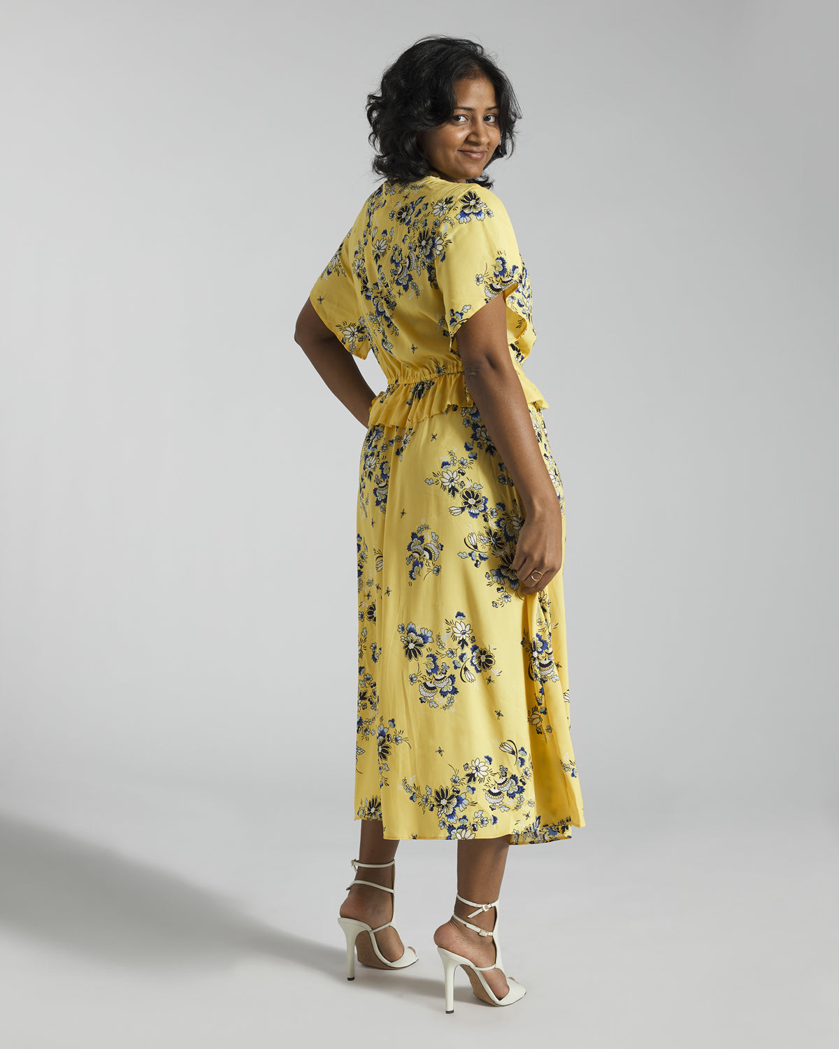 Between the fresh florals, sunny hues, and pretty ruffle detail, our tie-neck midi is a boho beauty. Split neck with ruffle and self-ties. Short sleeves. Shirred front shoulder seams. Front body pleats. Curved front peplum waist seam with back encased elastic and shirring beneath. Separate cami lining with adjustable shoulder straps and side slits at the hem.