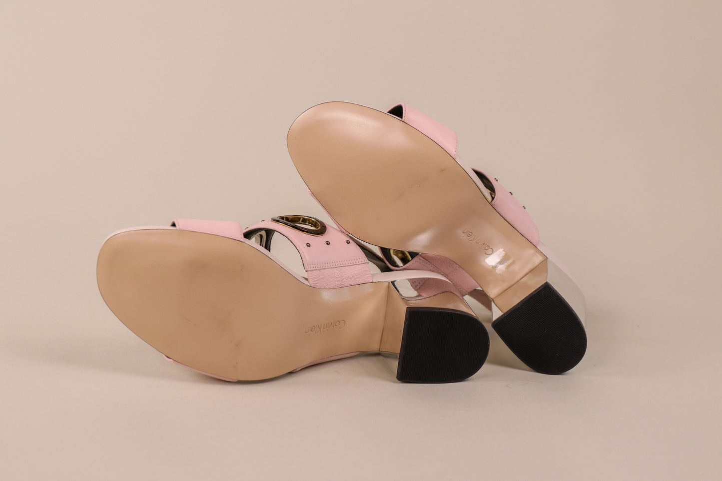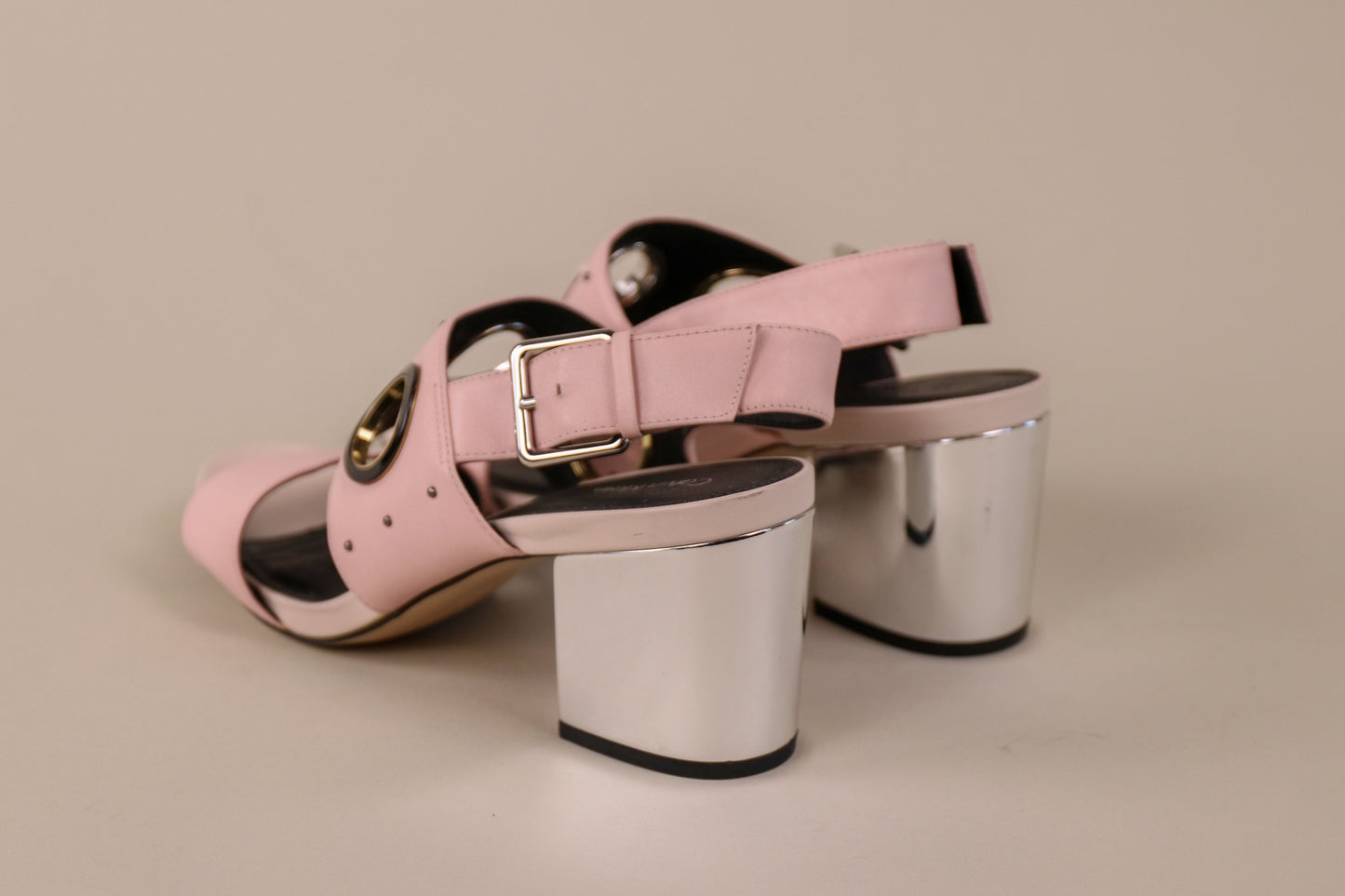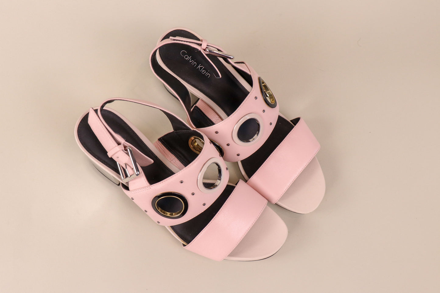 These classy pink, white, black cutout circles accents on straps with 3" silver heel buckle sandals may bring you back to the trends of Summer 2015. Still relevant and still eye catching