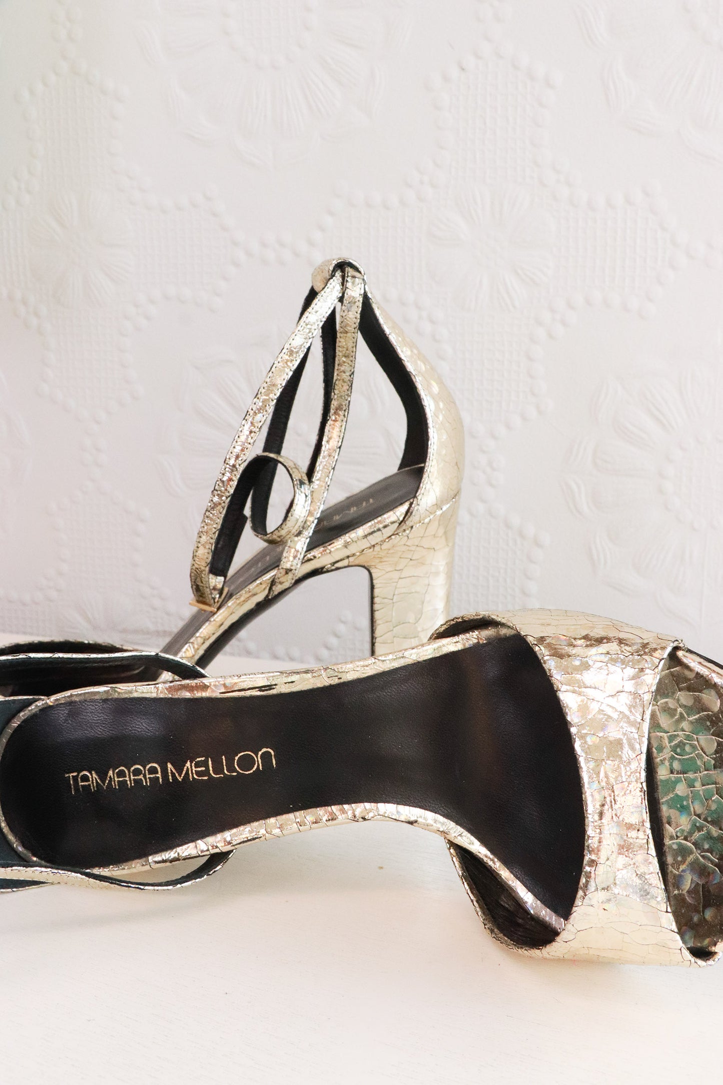 Jazz up any outfit with metallics! Grab these to simply strut around anytime of the year! Tamara Mellon brings a gold and iridescent elaphe with an open toe and ankle strap. This item is in great condition. The sole may reflect signs of storage with little to no sign of wear. Shoes only, no box.