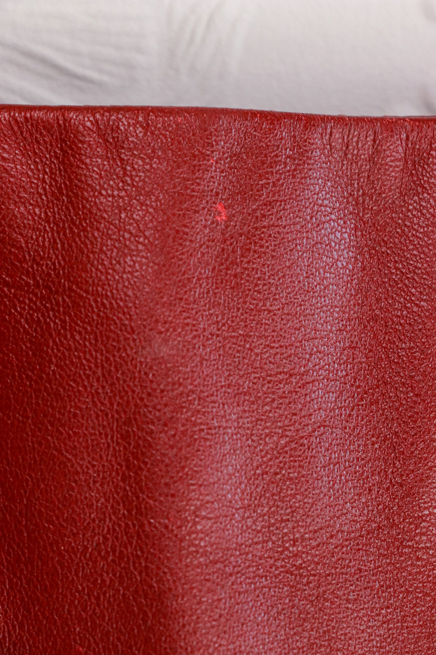 We are definitely categorizing this skirt as a Spring essential. With its mid length for warm breezy days and rich color, this skirt is made from leather with a rear zipper and button closure. This skirt is in good vintage condition with signs of wear to the leather (pictured)