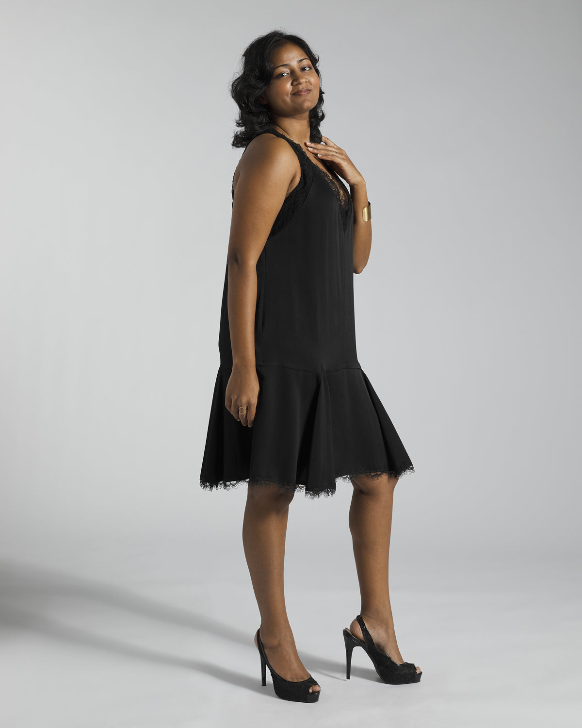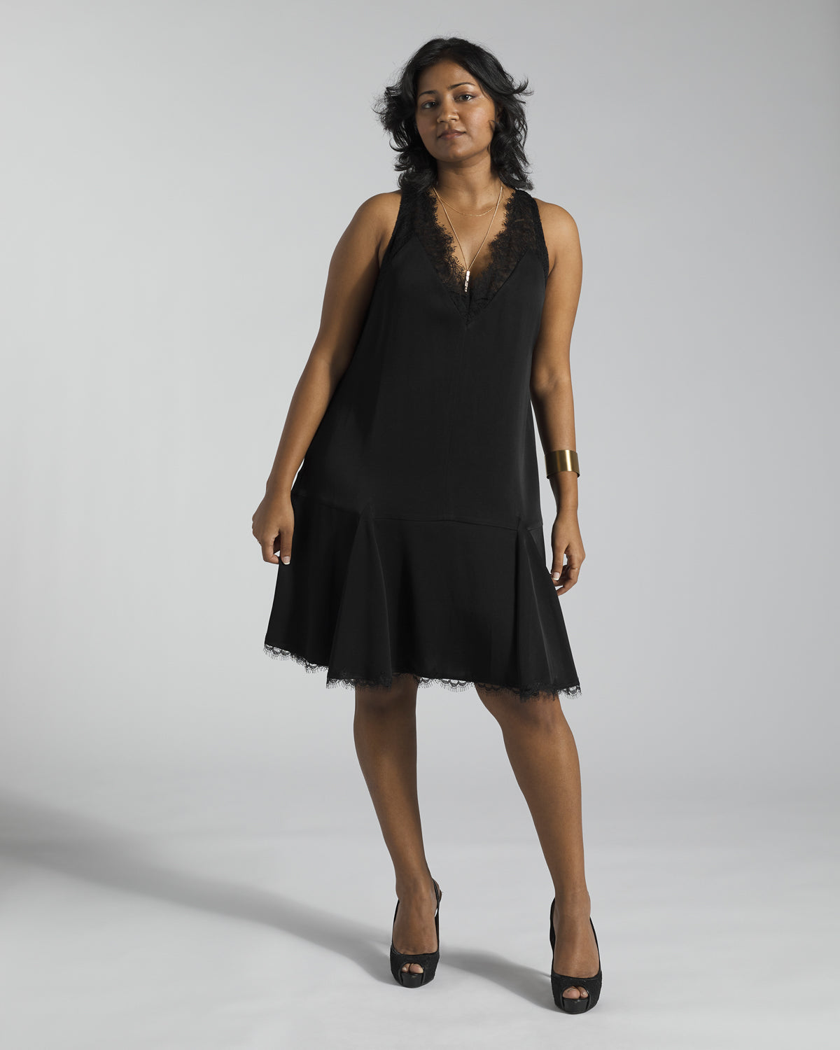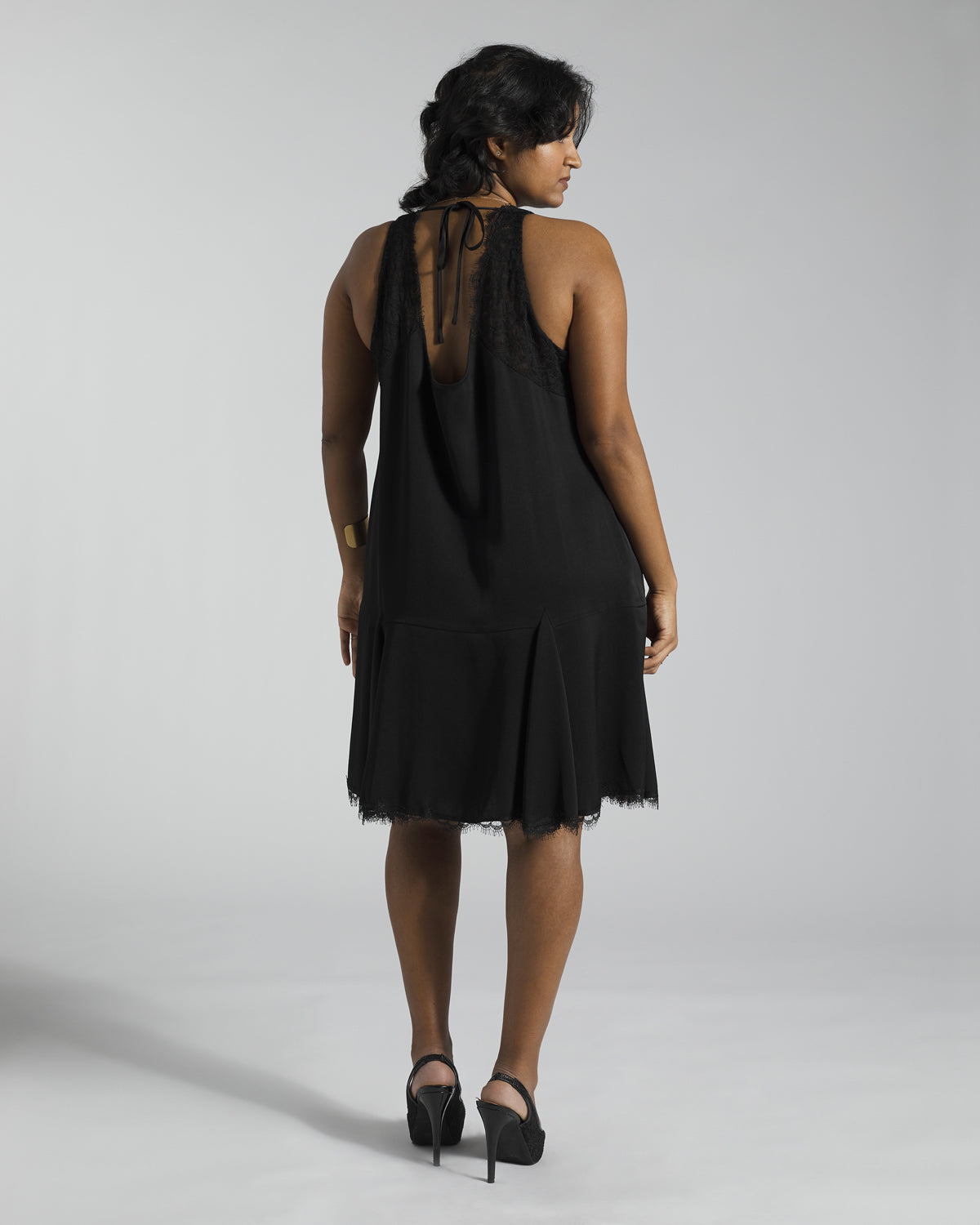The perfect little black dress. Lace detail on neckline and bottom hem. Drop waist with a flared skirt. Tie at the back of the neck.