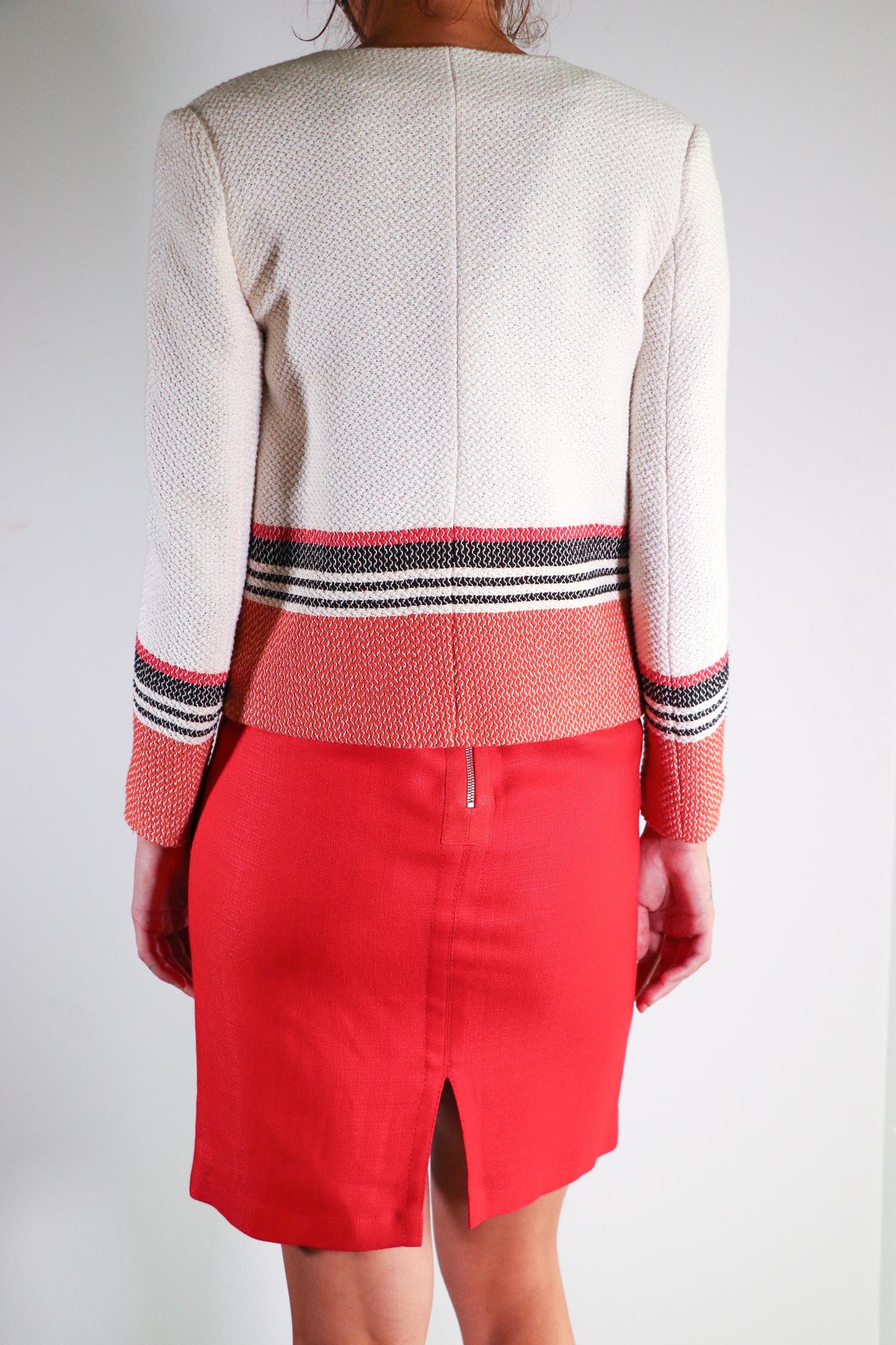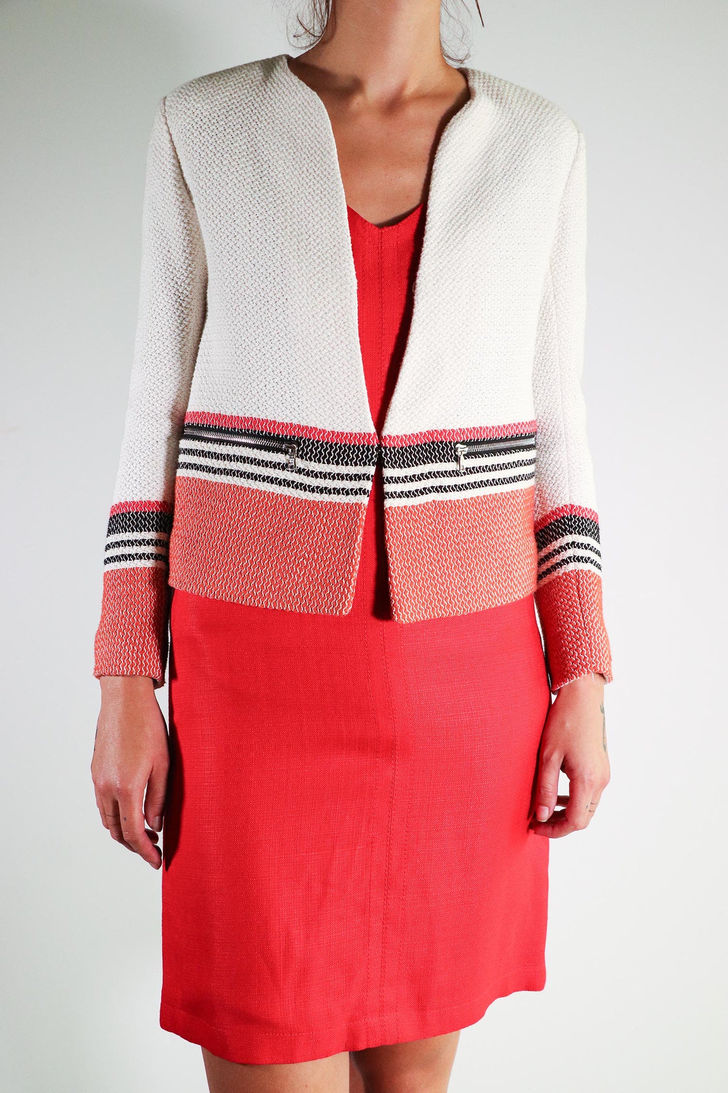 With structure and poise Sandro brings us a cream jacket blocked with bold colors of orange and black, 2 zip front pockets and 2 hook and eyes to close the front.
