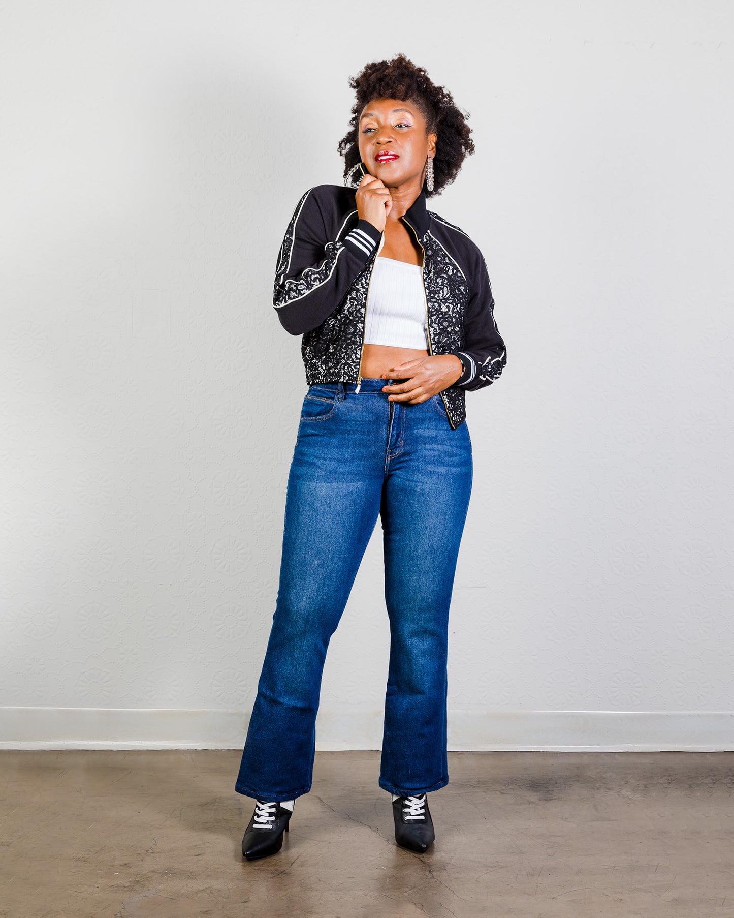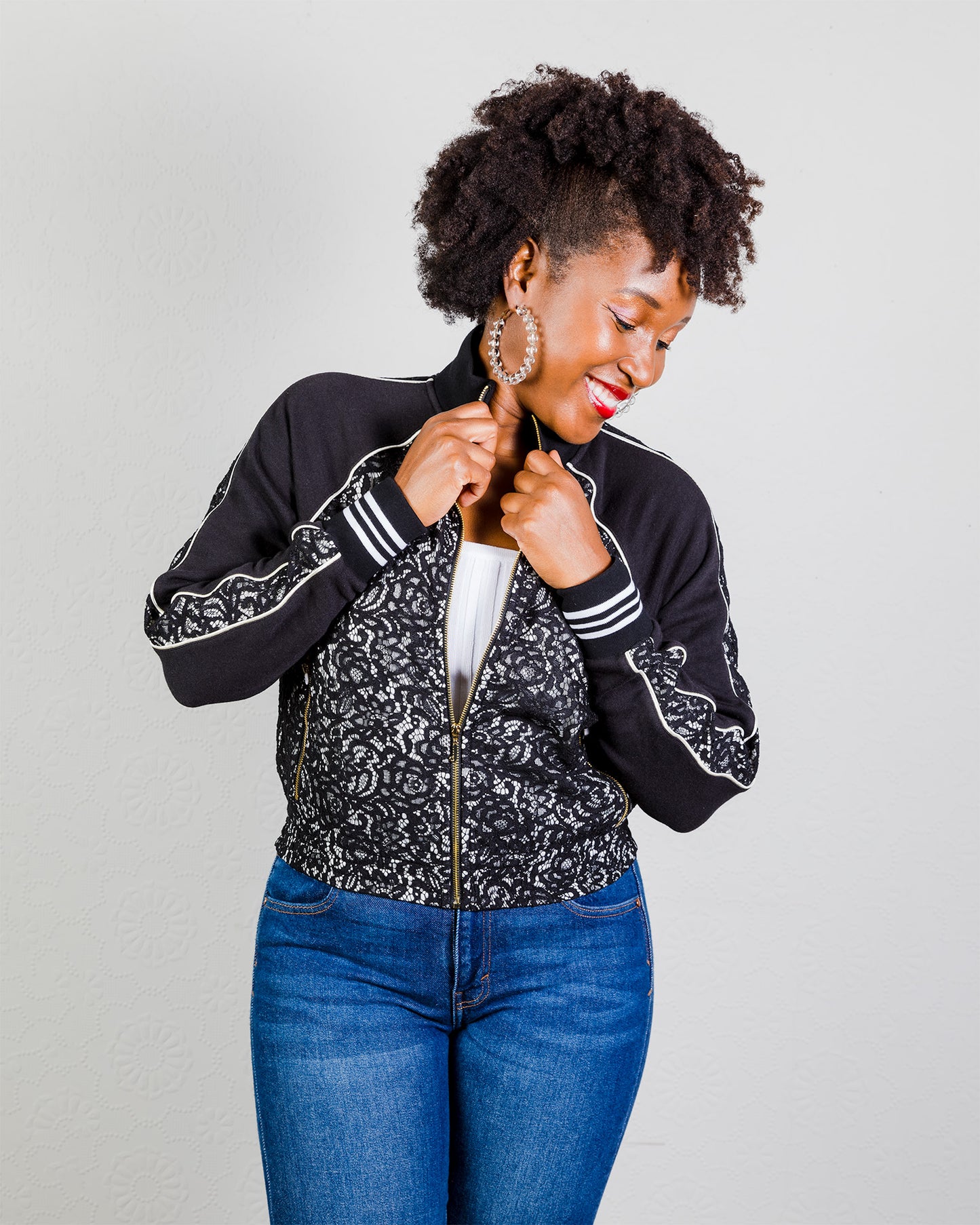 Pitch Black Terry Lace Track Jacket With White Pin Striping, Hidden Inside Pockets, Gold Zippered Front And Gold Zippered Front Pockets