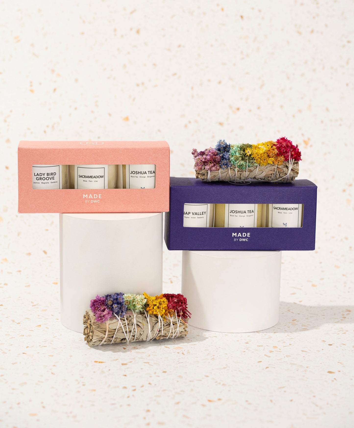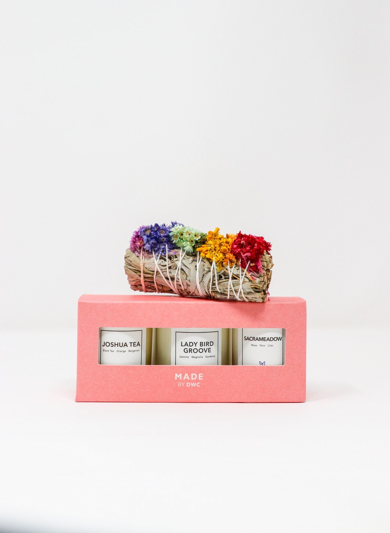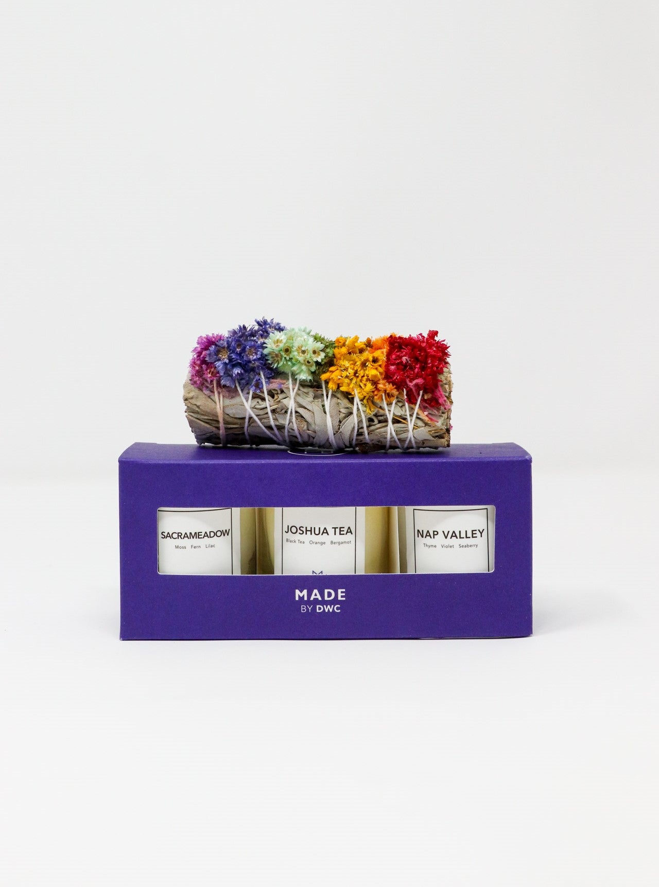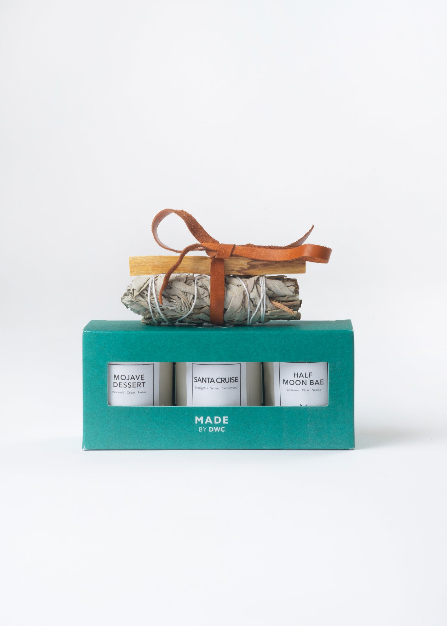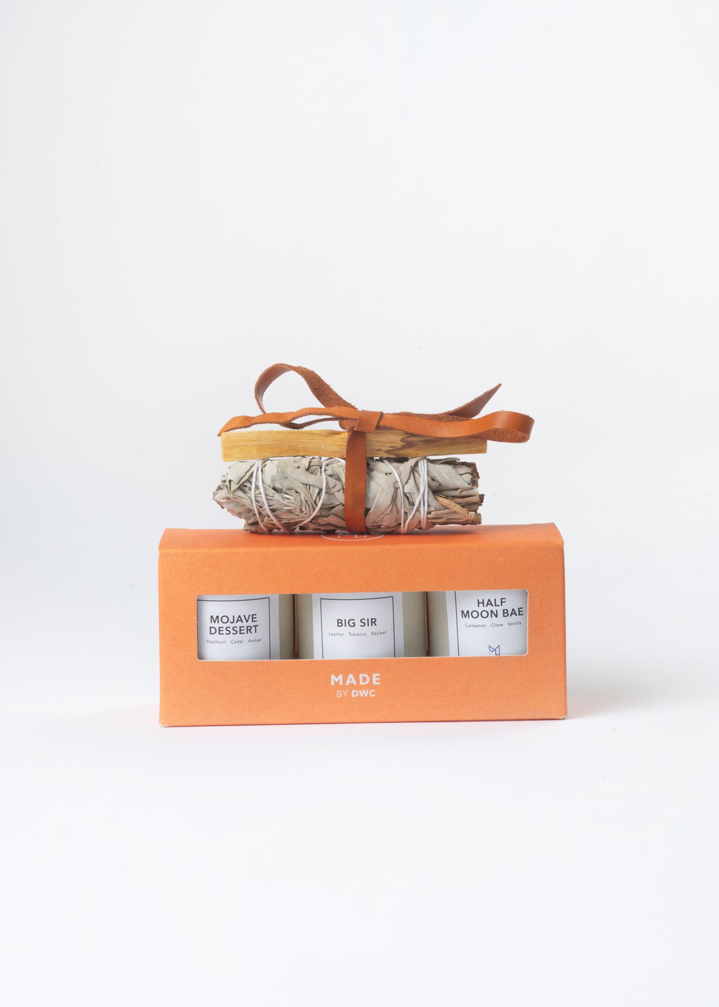 Trailblazer Pioneer: Reminiscent of coasts and campfires, this set pairs our Musk and Earth candle flights with ethically sourced palo santo and sage.